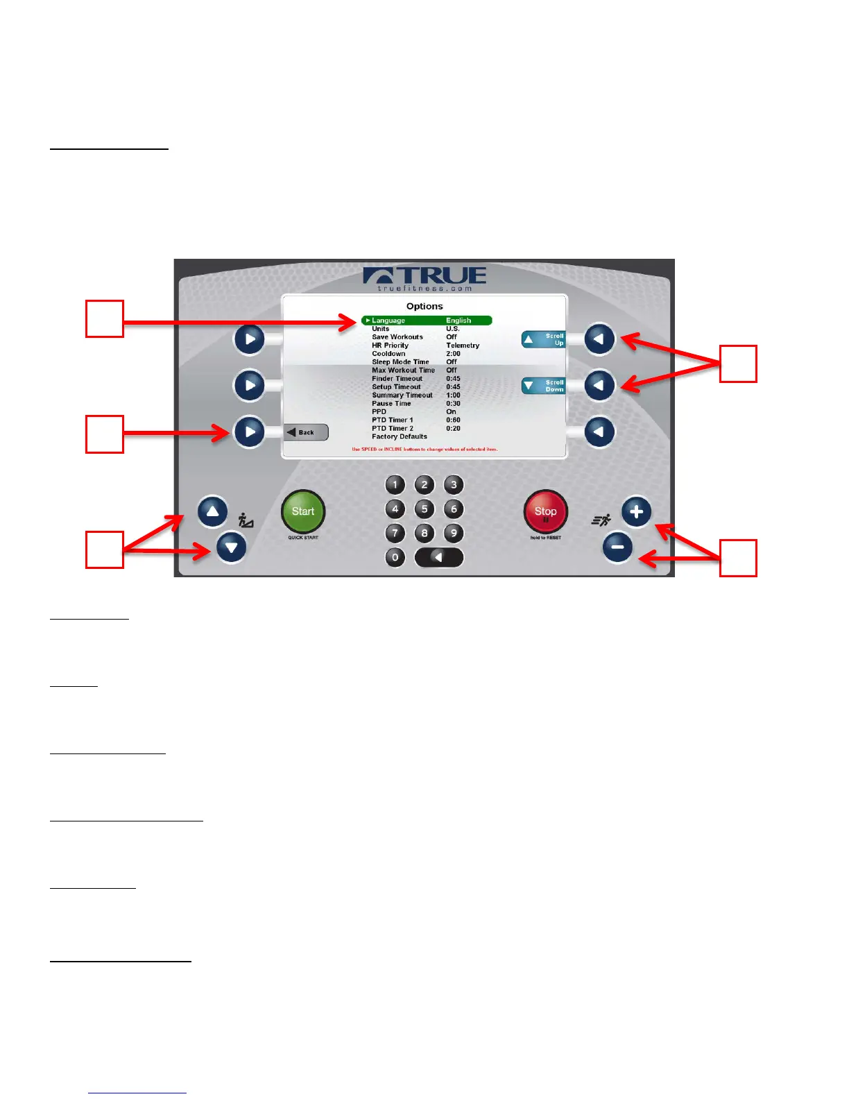 the option to be changed (B) and use the speed keys (C) or incline keys (D) to adjust the options. Once the changes are