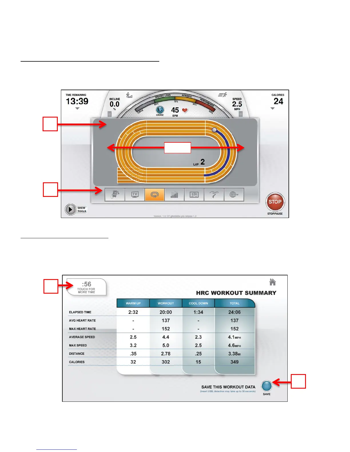 user requires more time to view the summary or to save the workout to a USB device, they can touch the timer (B) to