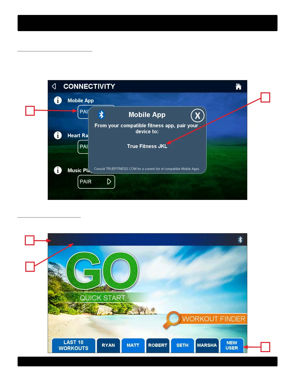 mobile app pairing screen. From the tness app, pair to the device (B)shown on the console.