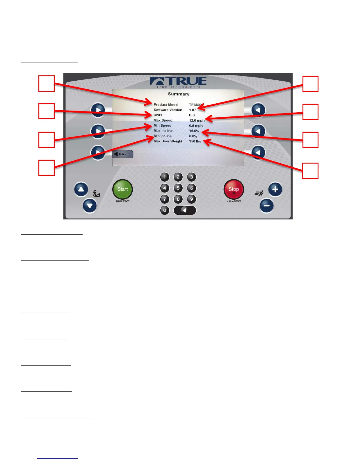 The Summary Screen provides an overview of the unit’s current settings (values cannot be changed in this screen).