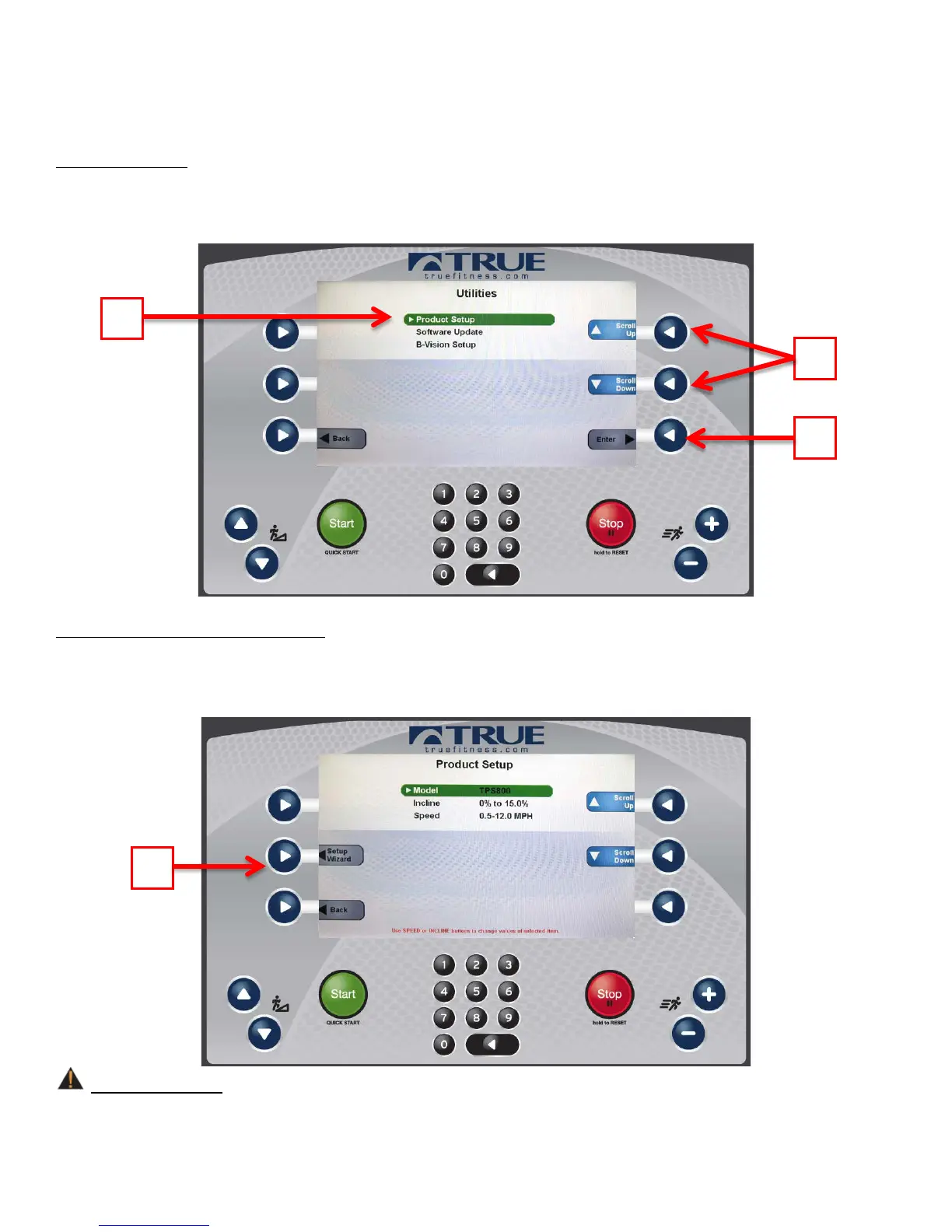The product setup screen allows for adjustments to model configuration, incline range, and speed range. TRUE’s