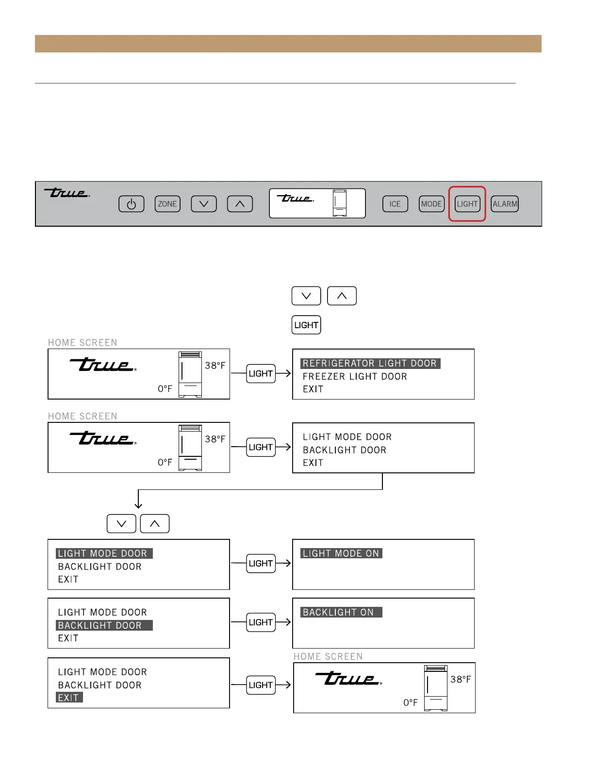 To energize the accent lighting system, press LIGHT and navigate to the corresponding compartment (see