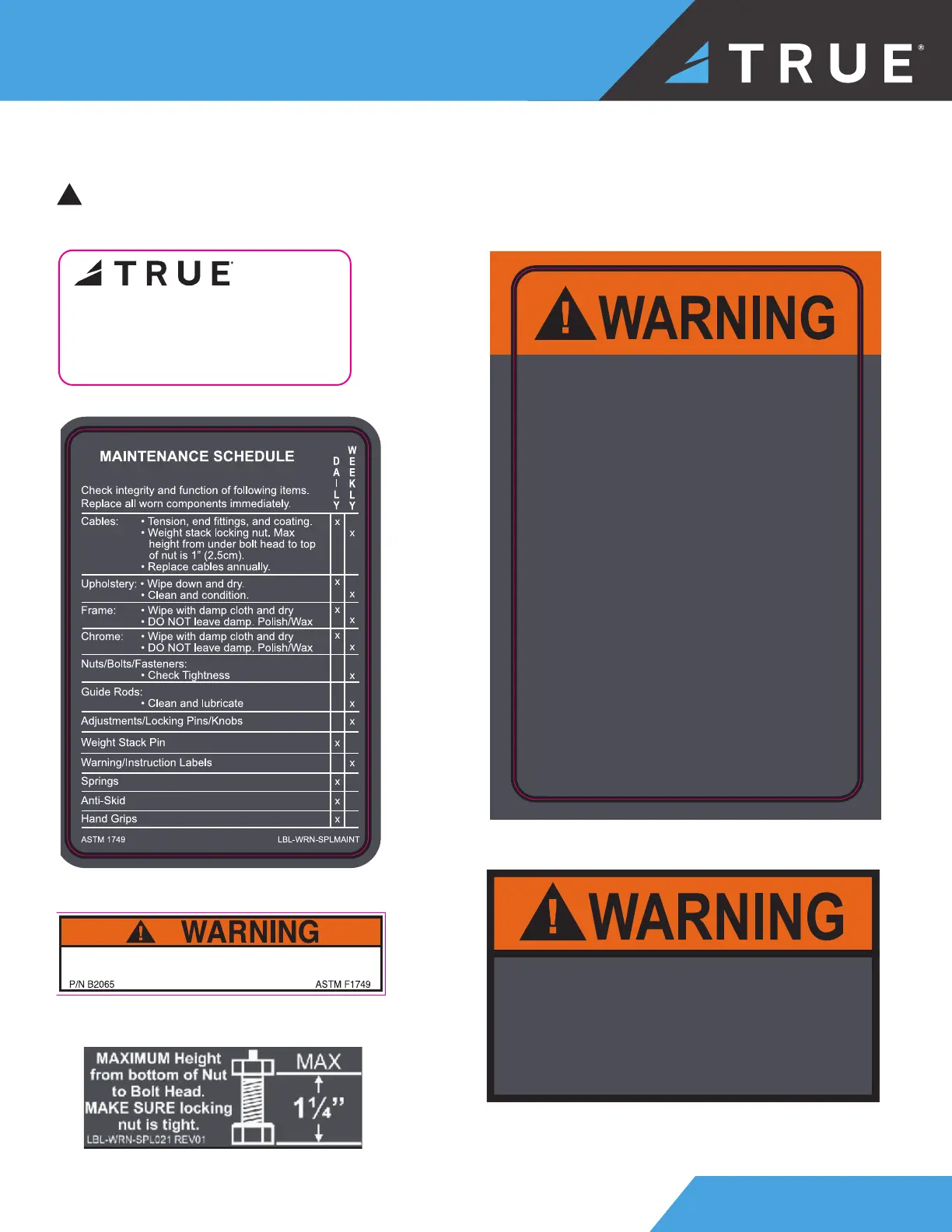 To replace any worn or missing decals contact TRUE product support (service@truefi tness.com // 800.883.8783).