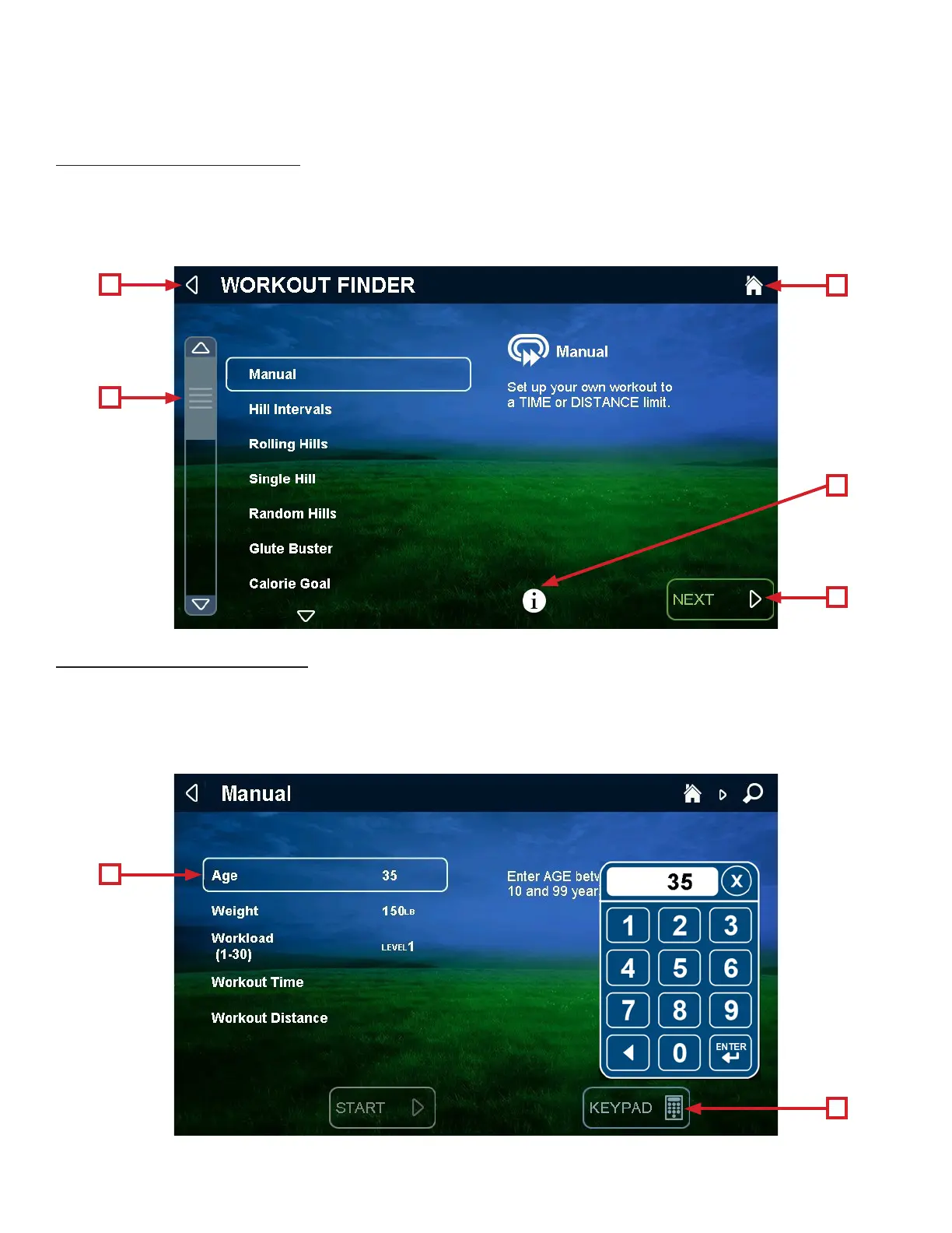 sweep up and down the selection list, highlight the desired workout, and touch Next (B) to select it.