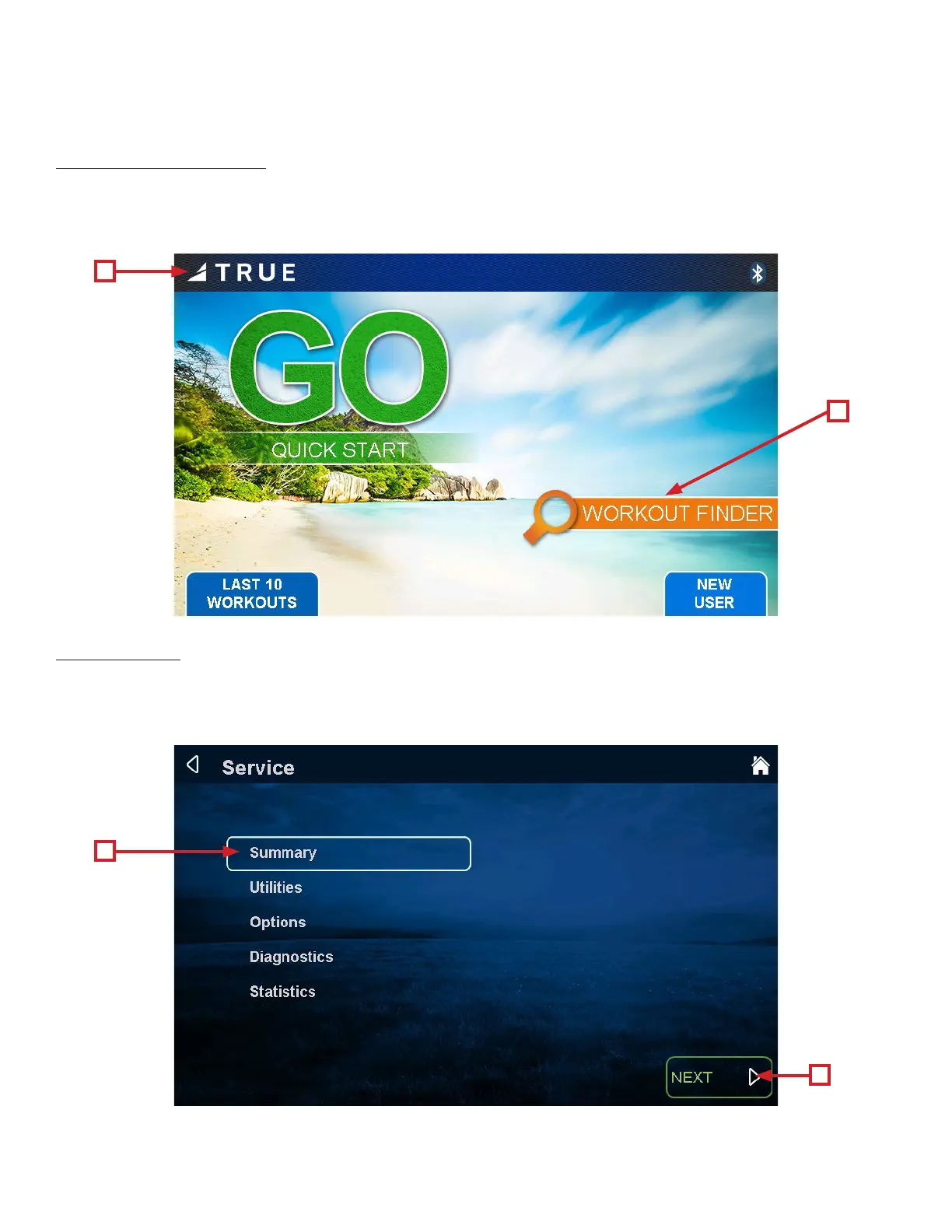 or until the TRUE logo begins to blink. Next, hold the “Workout Finder” icon (B) until the “Service” screen displays.