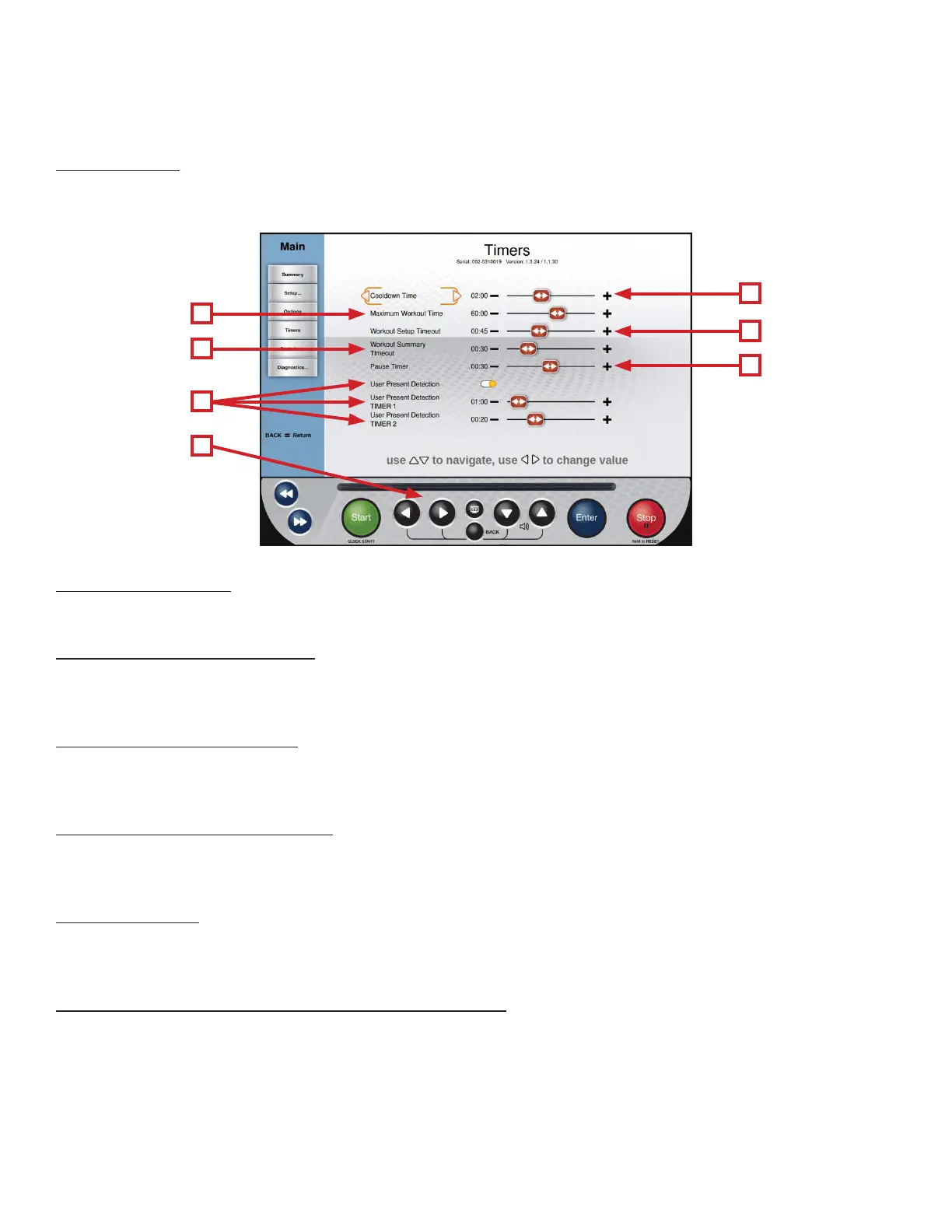 indicative of the weight of the user on the treadbelt. Timer 1 will set the amount of time before the console displays a User