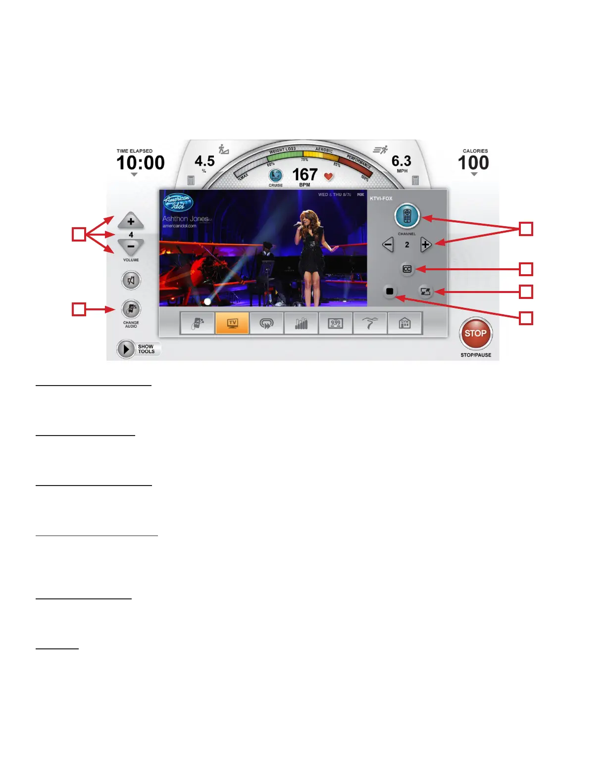 high Denition. e TV controls are built in to a Workout View Screen to allow the user to monitor their workout while