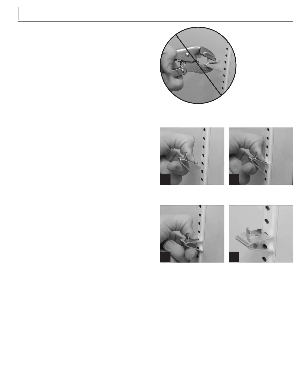 Install the top tab of the shelf clip into the proper hole. Push up on