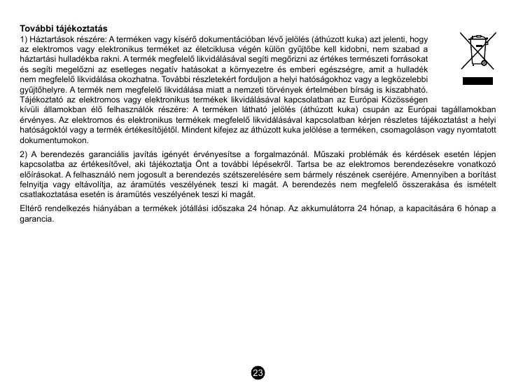 Eltérő rendelkezés hiányában a termékek jótállási időszaka 24 hónap. Az akkumulátorra 24 hónap, a kapacitására 6 hónap a