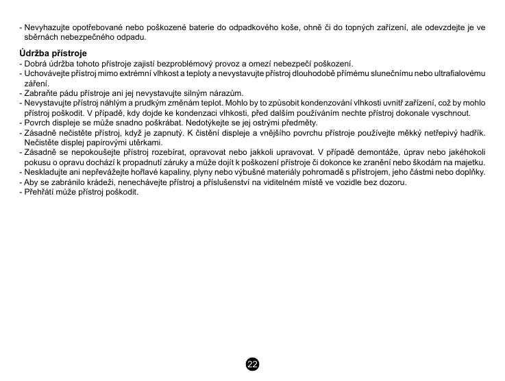 - Uchovávejte přístroj mimo extrémní vlhkost a teploty a nevystavujte přístroj dlouhodobě přímému slunečnímu nebo ultraalovému