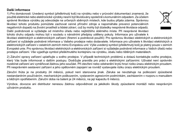 Záruční lhůta je na produkty 24 měsíců, pokud není stanovena jinak. Záruka se nevztahuje na poškození způsobené