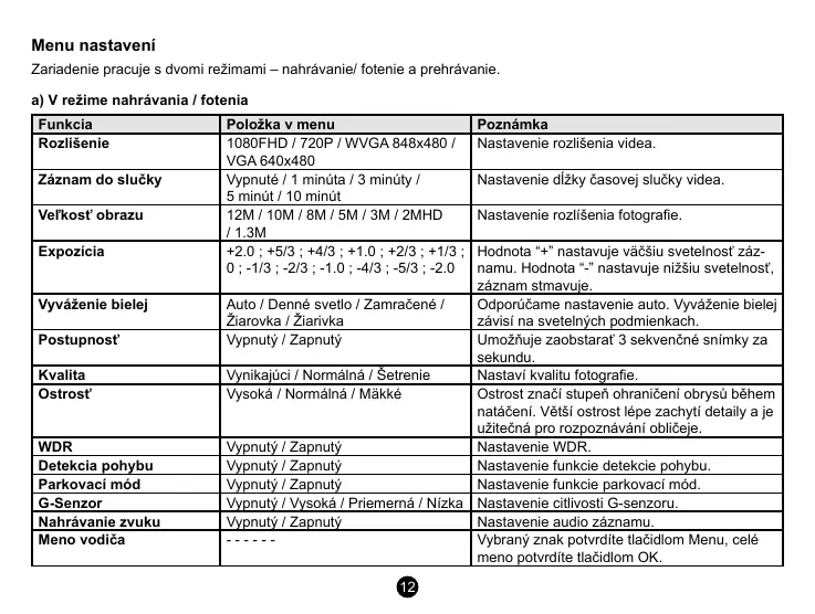 Zariadenie pracuje s dvomi režimami – nahrávanie/ fotenie a prehrávanie.