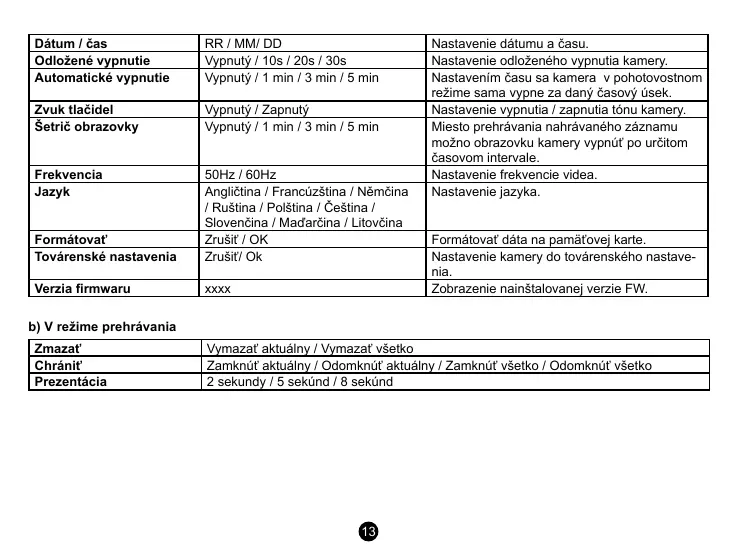 Vypnutý / 1 min / 3 min / 5 min Nastavením času sa kamera v pohotovostnom