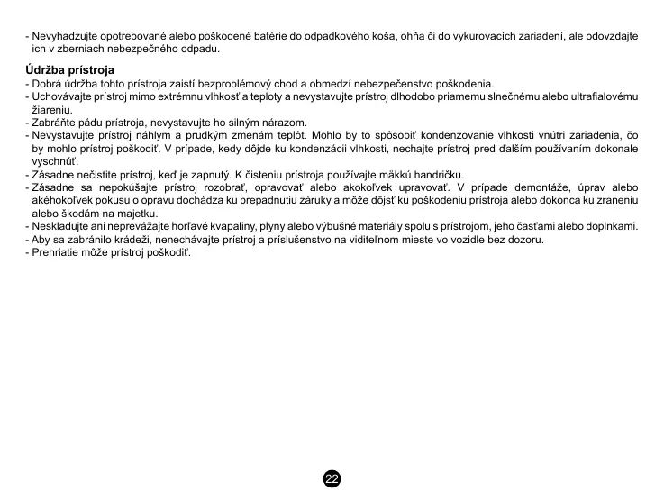 - Uchovávajte prístroj mimo extrémnu vlhkosť a teploty a nevystavujte prístroj dlhodobo priamemu slnečnému alebo ultraalovému