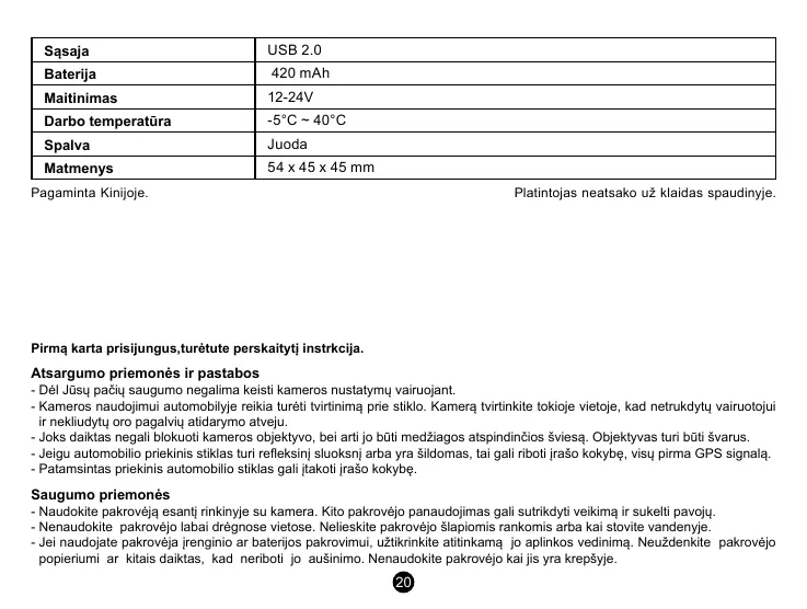 - Kameros naudojimui automobilyje reikia turėti tvirtinimą prie stiklo. Kamerą tvirtinkite tokioje vietoje, kad netrukdytų vairuotojui