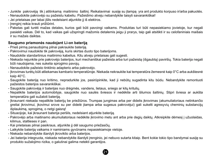 - Įkraunant niekada nepalikite baterijų be priežiūros. Trumpas jungimas arba per didelis įkrovimas (akumuliatoriaus netinkančio