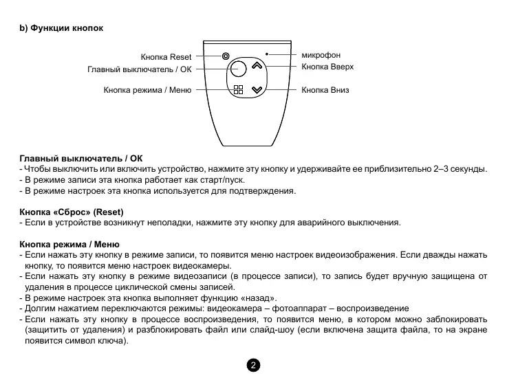 - Долгим нажатием переключаются режимы: видеокамера – фотоаппарат – воспроизведение