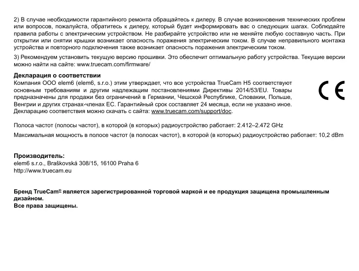 Компания ООО elem6 (elem6, s.r.o.) этим утверждает, что все устройства TrueCam H5 соответствуют