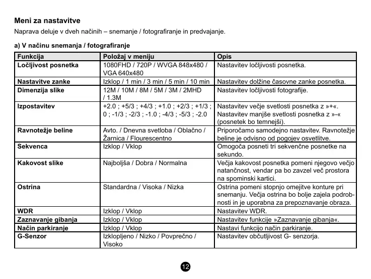 Naprava deluje v dveh načinih – snemanje / fotograranje in predvajanje.