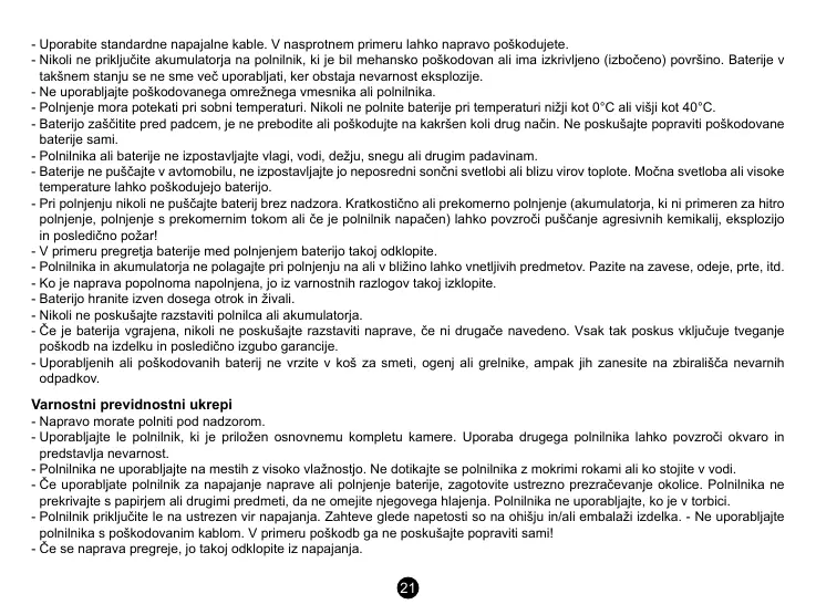 - Uporabljajte le polnilnik, ki je priložen osnovnemu kompletu kamere. Uporaba drugega polnilnika lahko povzroči okvaro in