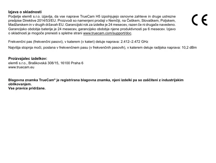Podjetje elem6 s.r.o. izjavlja, da vse naprave TrueCam H5 izpolnjujejo osnovne zahteve in druge ustrezne
