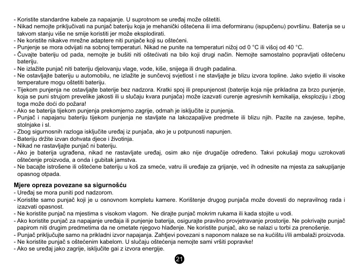 - Koristite samo punjač koji je u osnovnom kompletu kamere. Korištenje drugog punjača može dovesti do nepravilnog rada i