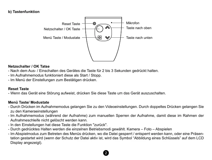 - Durch gedrücktes Halten werden die einzelnen Betriebsmodi gewählt. Kamera – Foto – Abspielen