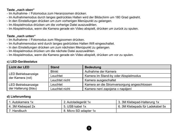 1. Autokamera 1x 2. Autoladegerät 1x 3. 3M Klebepad-Halterung 1x