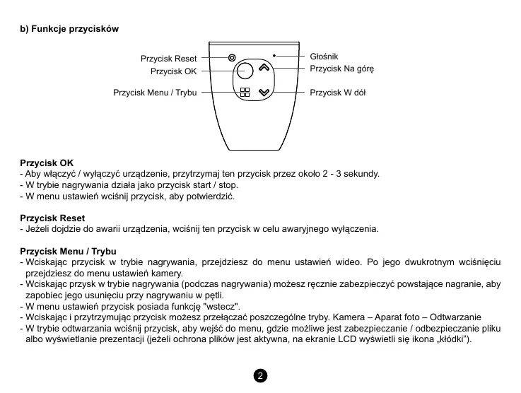 - Wciskając i przytrzymując przycisk możesz przełączać poszczególne tryby. Kamera – Aparat foto – Odtwarzanie