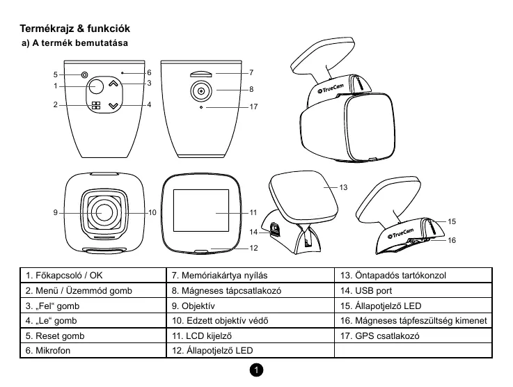 1. Főkapcsoló / OK 7. Memóriakártya nyílás 13. Öntapadós tartókonzol