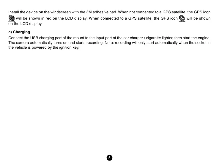 Install the device on the windscreen with the 3M adhesive pad. When not connected to a GPS satellite, the GPS icon