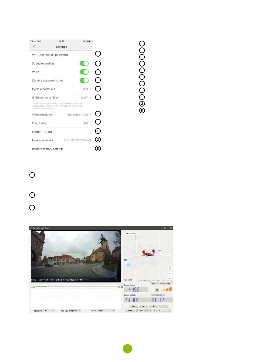 Zároveň s videom je možné sledovať údaje o rýchlosti, GPS súradniciach a trasu na mape
