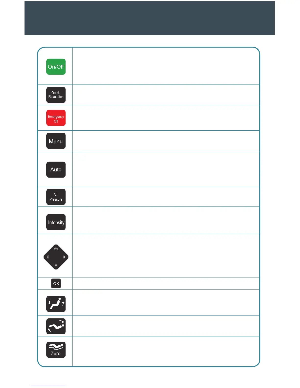 3. Emergency o. This button will stop all massage functions, and the chair will return
