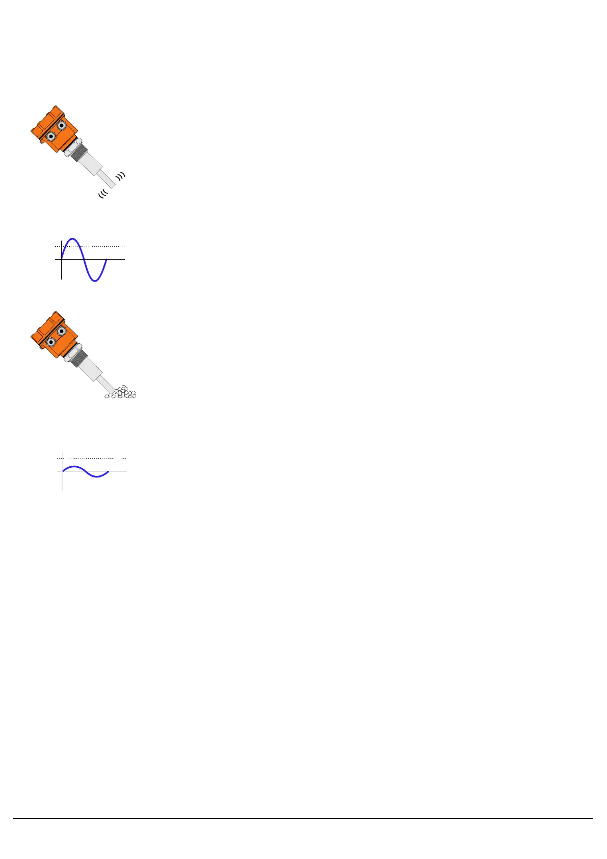 Amplitude of vibration, as sensed by the electronics falls below the threshold, material presence is