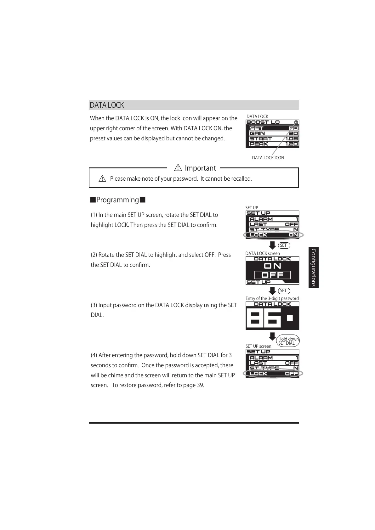 (3)InputpasswordontheDATALOCKdisplayusingtheSET