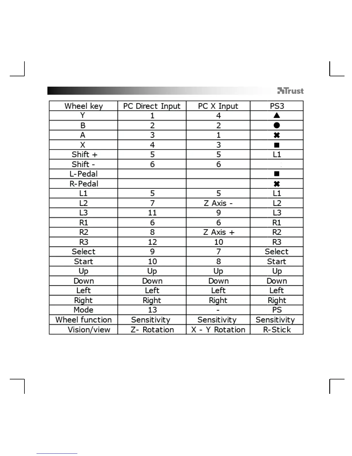 Trust GXT 288 - Button Mapping; Key Assignments Table