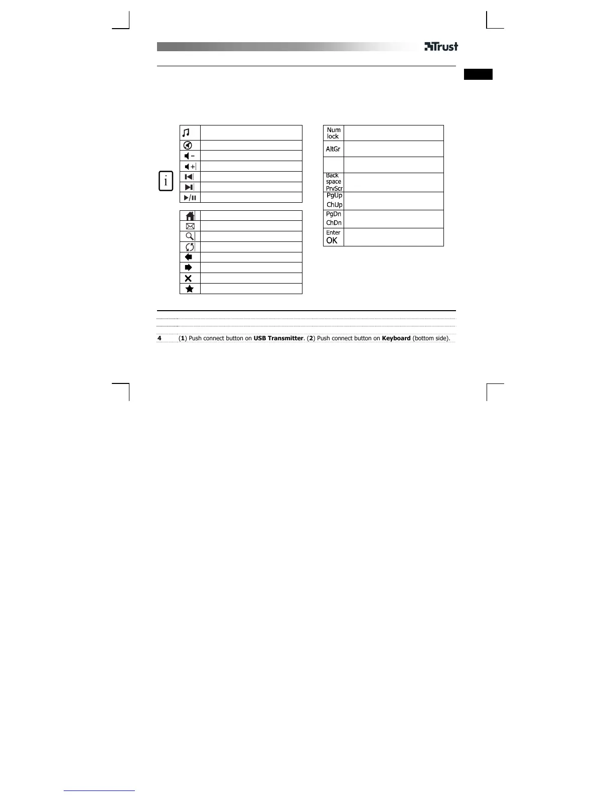 4 (1) Push connect button on USB Transmitter. (2) Push connect button on Keyboard (bottom side).