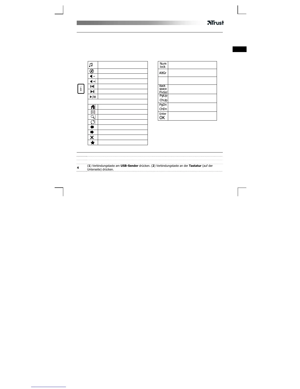 (1) Verbindungstaste am USB-Sender drücken. (2) Verbindungstaste an der Tastatur (auf der