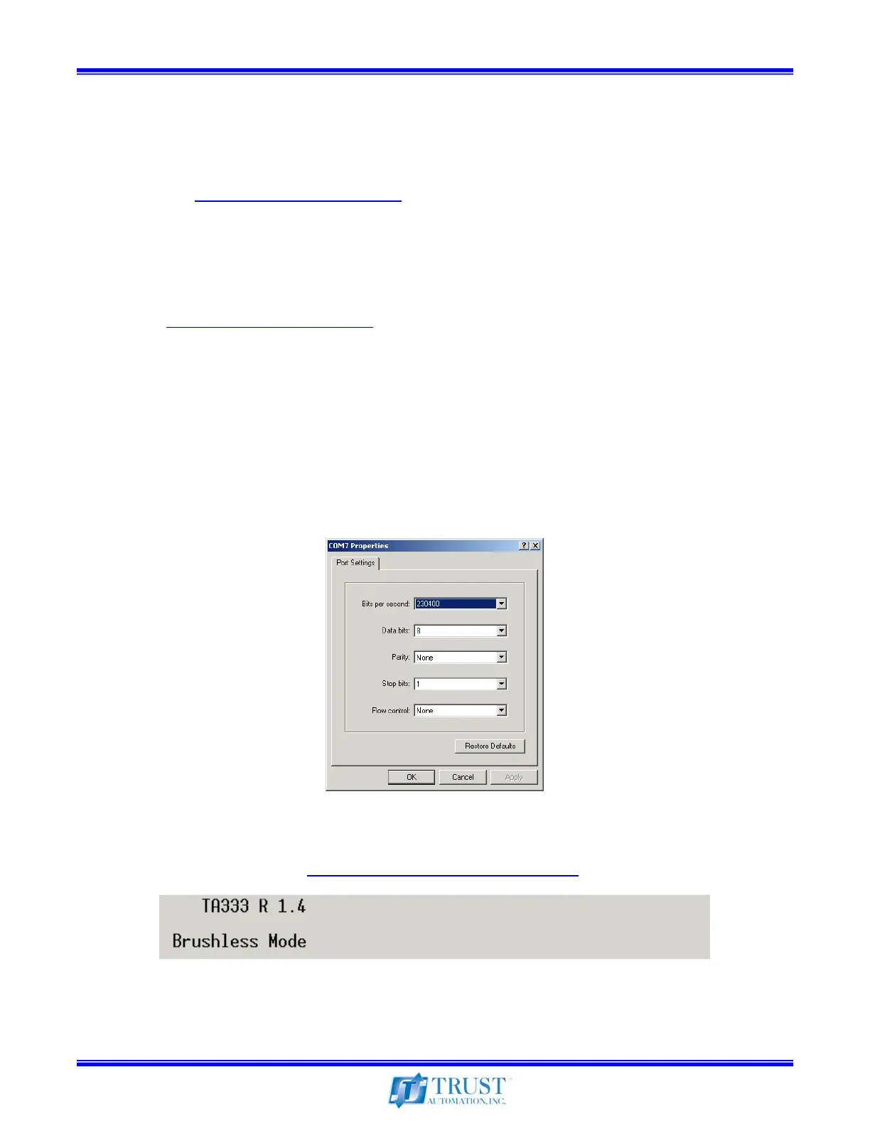 When the TA333 is powered up, the serial port will transmit the firmware version and the drive mode