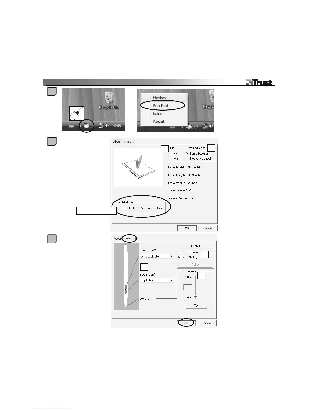 Trust TB-7300 - Pen Configuration; Measurement and Tracking Modes; Button and Pressure Settings