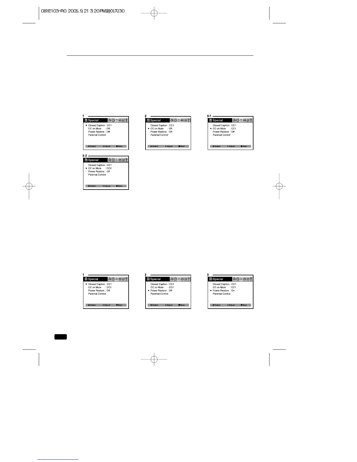 1.With the TV turned on, press the MENU button until “Special”menu