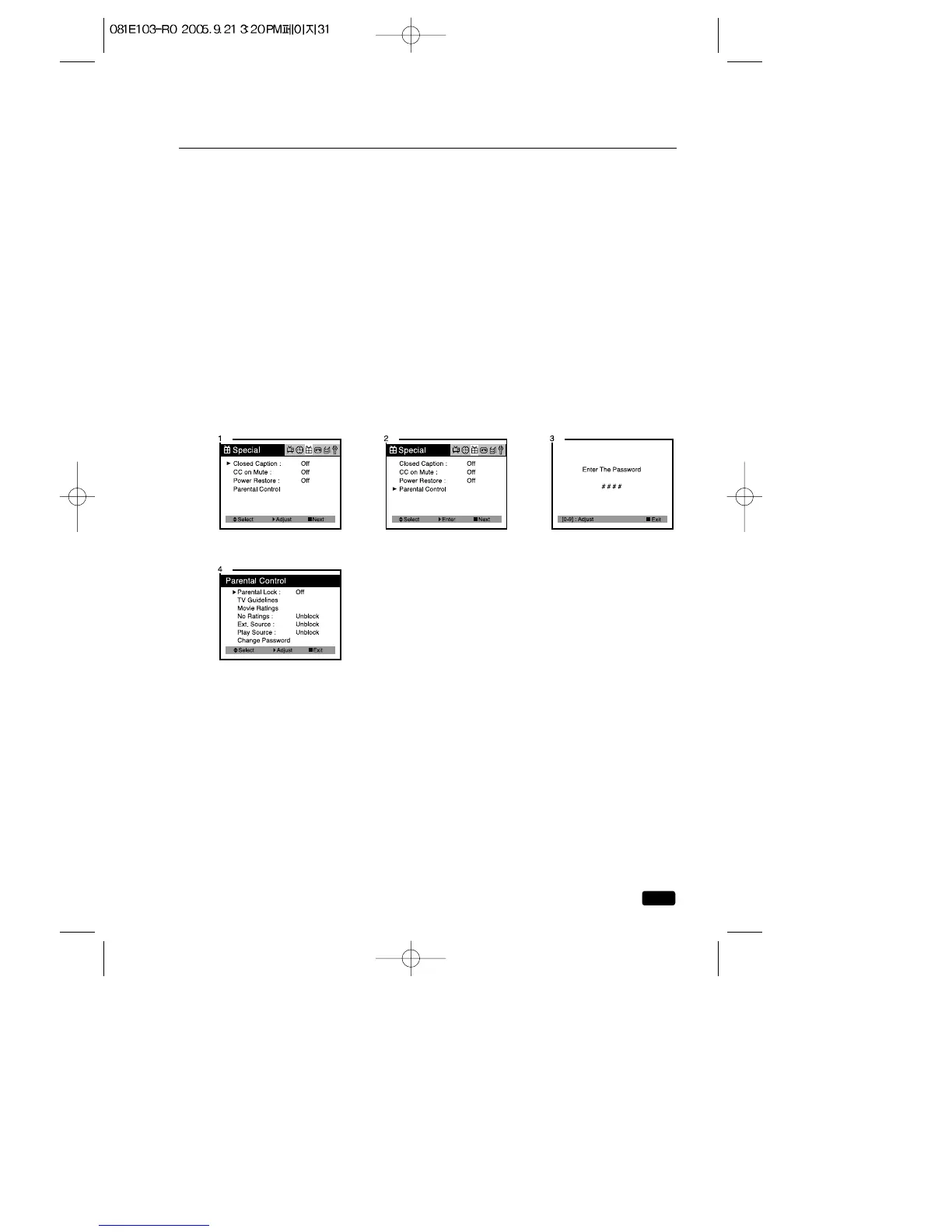 4.Use the ▲CH▼ buttons to select Parental Control settings you wish
