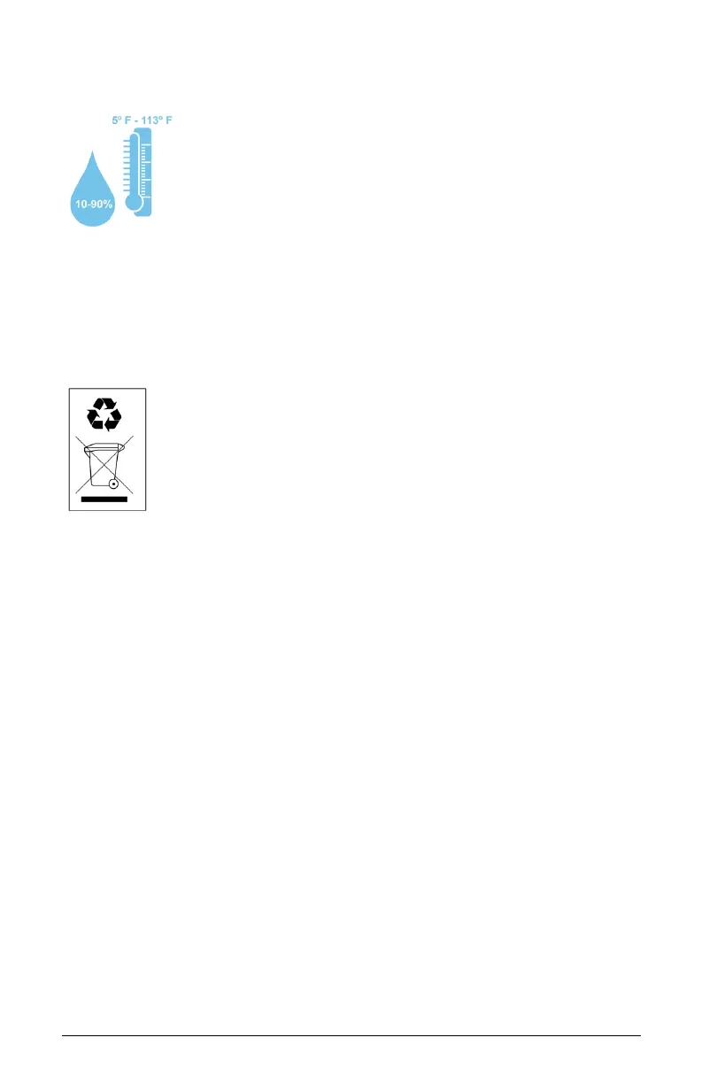 a temperature range of 5º F to 113º F (-15º C to 45º C); humidity 10% RH to