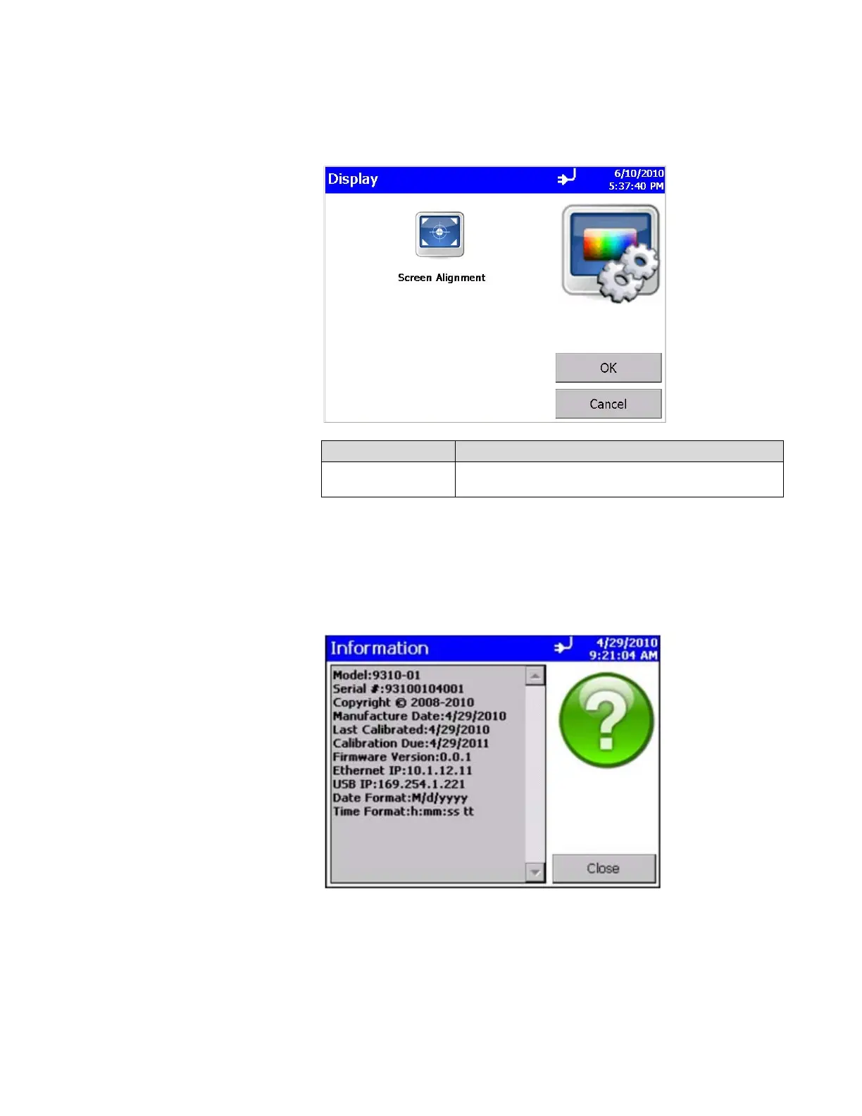 copyright, manufacture date, calibration date, next calibration