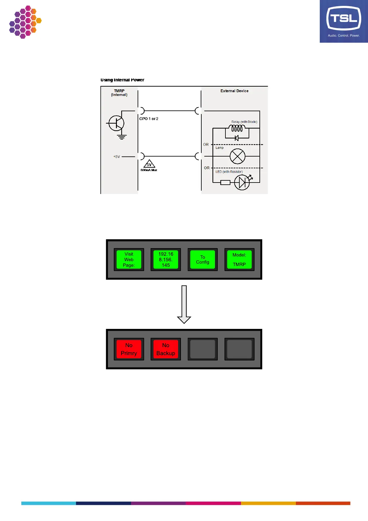 When first powered the TMRP will display its current IP settings and model number for a few seconds