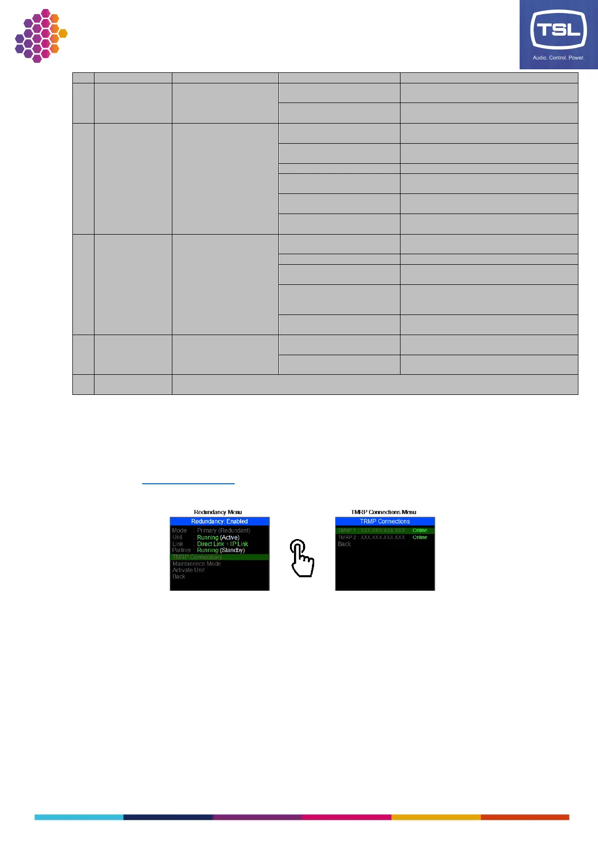 display will show the IP address and status of any TMRPs that have been configured in the redundancy