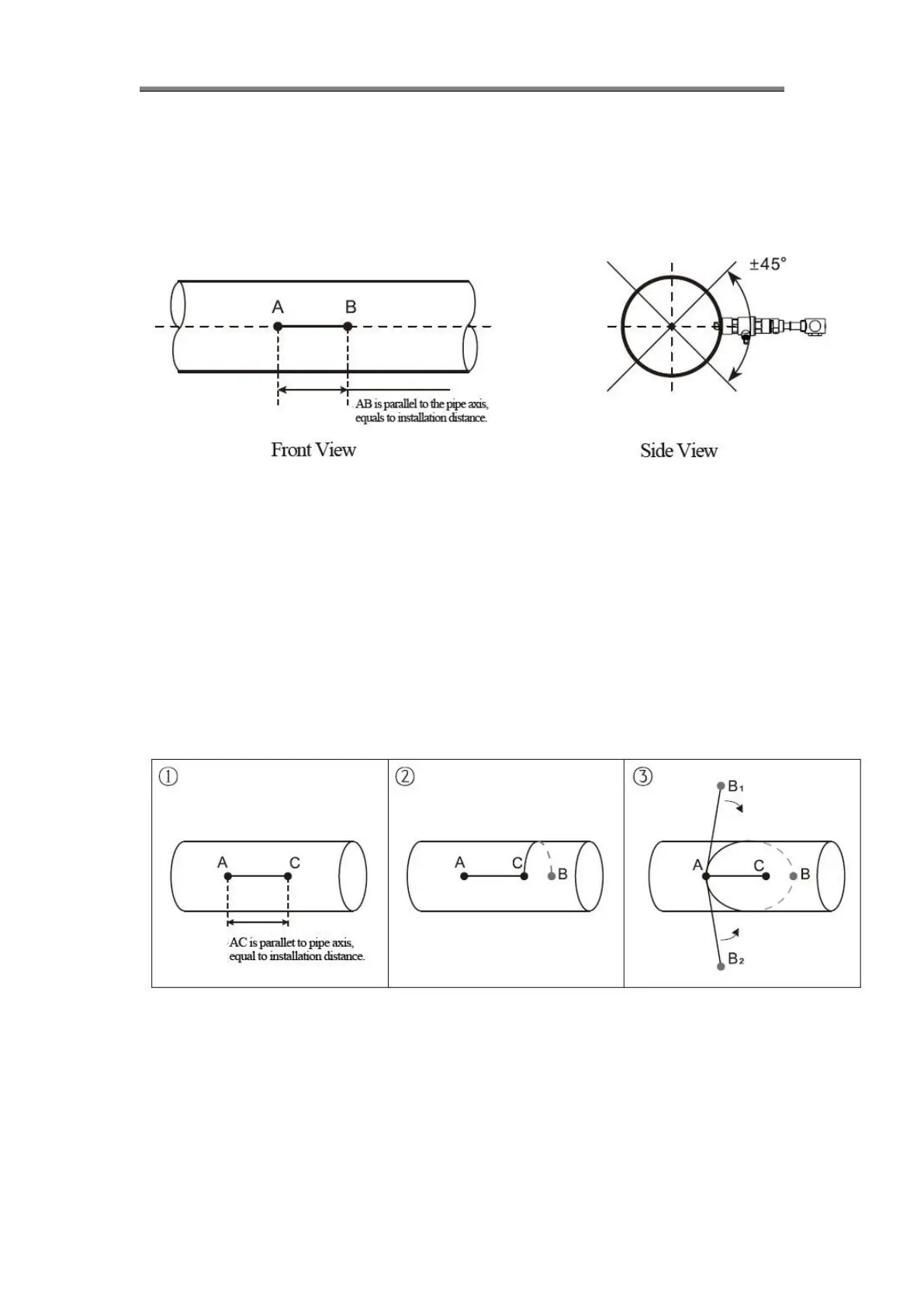 The line between two transducers is parallel to pipe axis, and equal to the distance shown in the