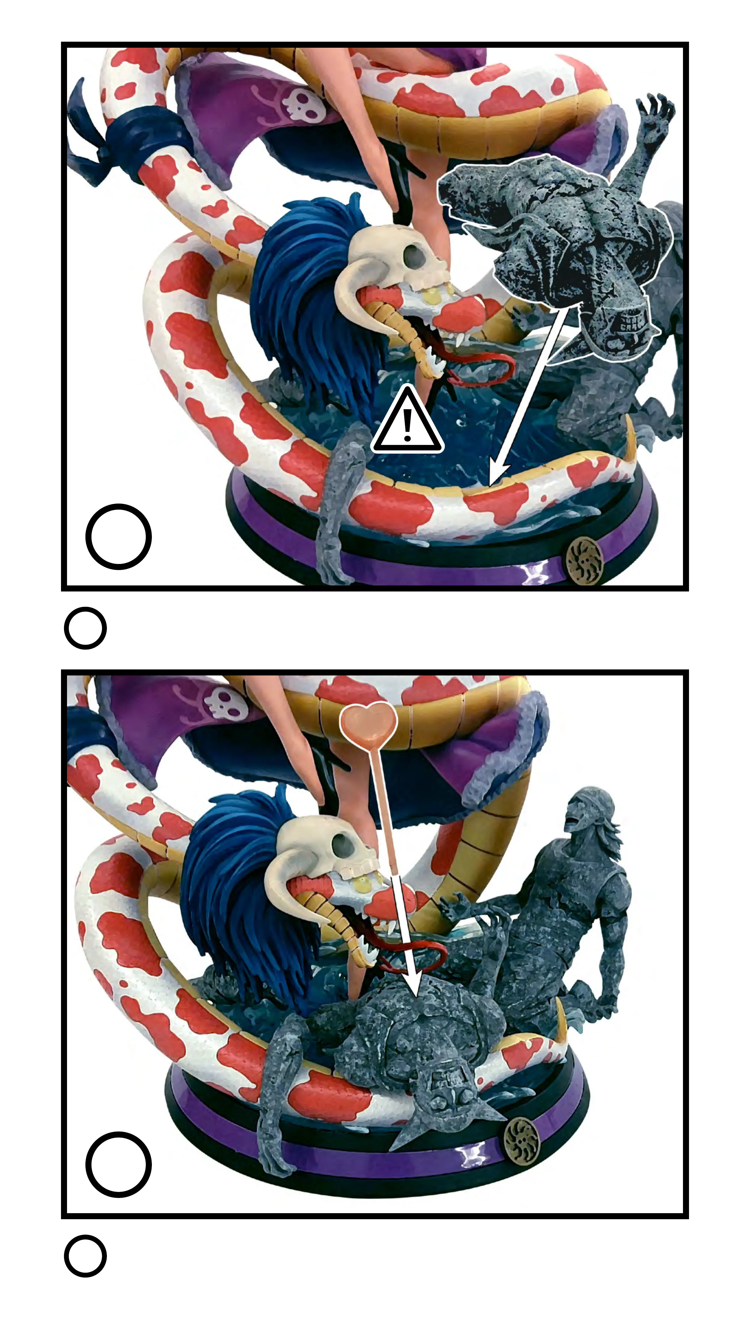 Insérez le personnage pétrifié dans le corps du serpent. Attention à ne pas heurter le menton du serpent.