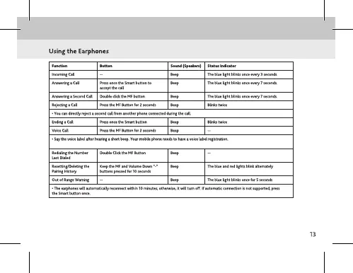 • The earphones will automatically reconnect within 10 minutes; otherwise, it will turn off. If automatic connection is n ot supported, press