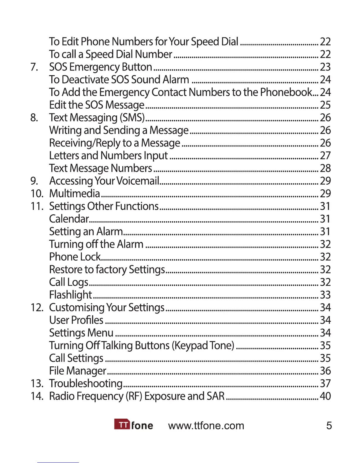 ttfone TT100 Comet - SOS Emergency Button; Text Messaging (SMS); Accessing Your Voicemail; Multimedia